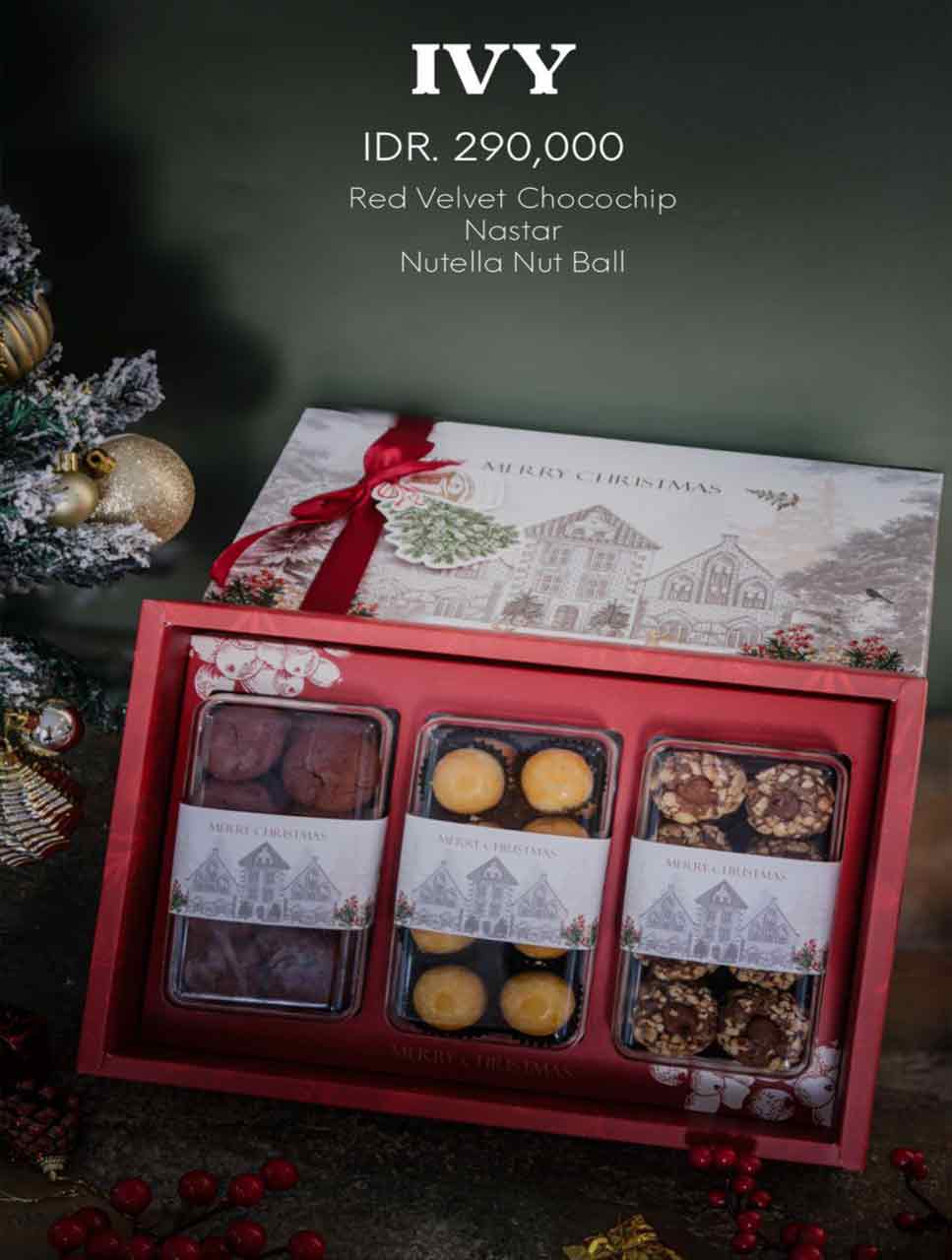 Nutella Nut Choco Ball-Nastar-Sagu Keju-Palm Sugar Chees- Red Velvet Chocochip-Lexus Biscuit-Tobleron Chocolate-Tongajie Tea- Nissin Lemonia Kaleng-Deka Wafer Roll Kaleng-Cavendish Candy-Chocopie-Mini lampu Pohon Natal- Lap Tangan - Marjan Cocopandan- Monde Eggroll-Ranzzi Cookies-Cremona Hazelnut Chocolate *Packing Gold D-30,T-60